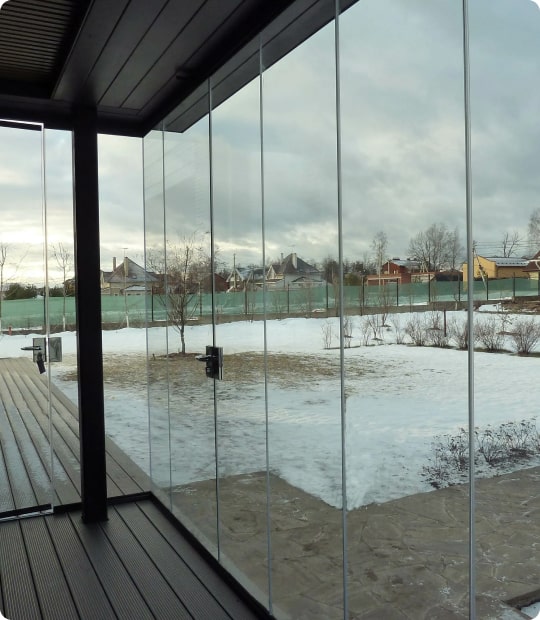 Технология, появившаяся в Финляндии, отличается отсутствием рам или перекладин. Она создает впечатление цельной стеклянной стены, что выглядит воздушно и легко, визуально расширяя пространство. Многие считают такое решение красивым, поэтому все больше компаний изготавливают, а также делают монтаж безрамного остекления.
